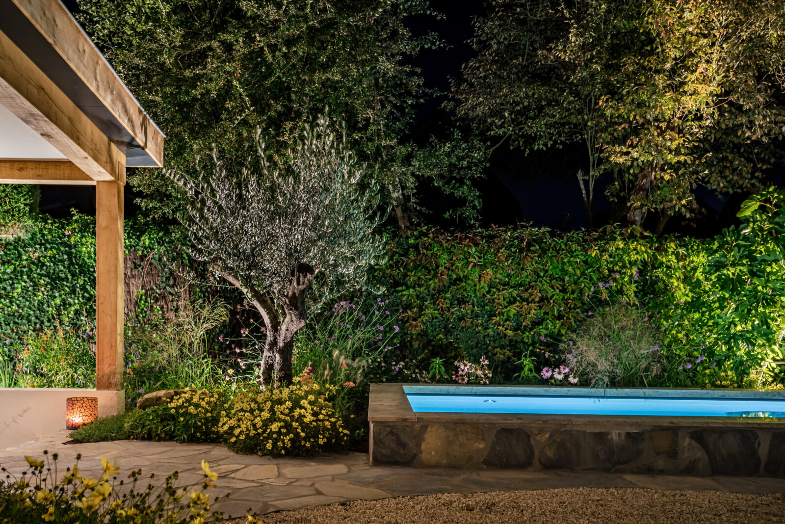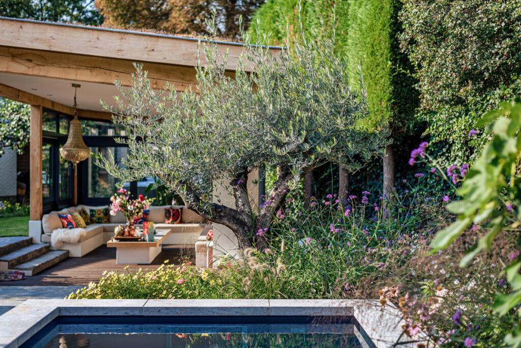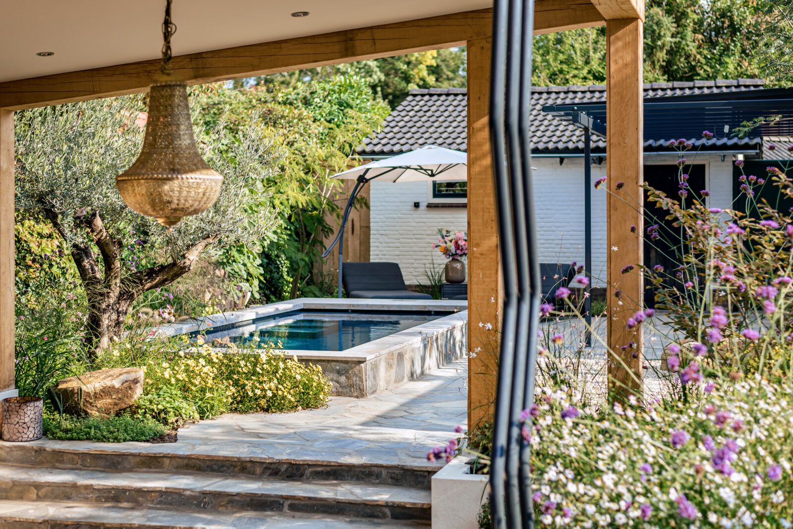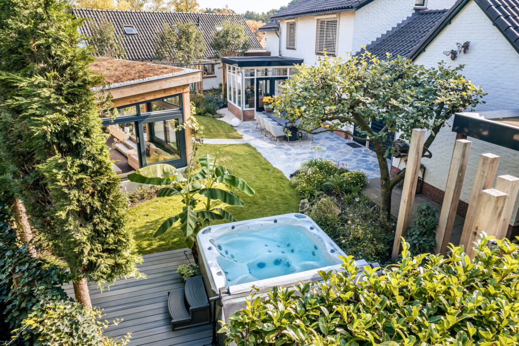 Als Italië liefhebbers werd er voor een tuinontwerp gekozen met een warme, mediterrane sfeer. “Wij houden van Italië en wilde deze sfeer ook thuis voelen. We houden van kleur en veel bloemen, maar ook van luxe. Tim heeft onze wensen daarin perfect omgezet in realiteit. Het hele plaatje klopt: van de luxe jacuzzi en het zwembad tot de kleurrijke beplanting en ronde vormen die in de hele tuin terugkomen.”