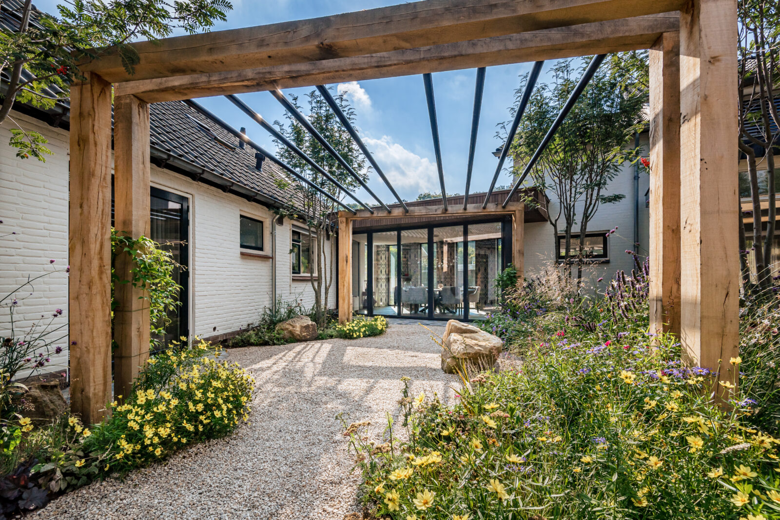 De familie had de wens om veel buiten te kunnen zijn, ook in de koudere maanden. Dit hebben we gerealiseerd door van de binnen- en buitenruimtes één geheel te maken. De serre kan helemaal open, en daarmee wordt alles echt een. “Wanneer je in de serre zit, zit je midden in de tuin. En daarmee ook midden tussen het groen en de kleurrijke bloemen. Hierdoor heb je altijd het gevoel alsof je buiten bent, ook al ben je dat in theorie niet. Dat is echt heerlijk”, vertelt Nicolette.