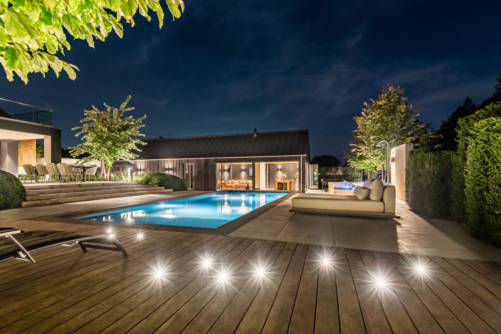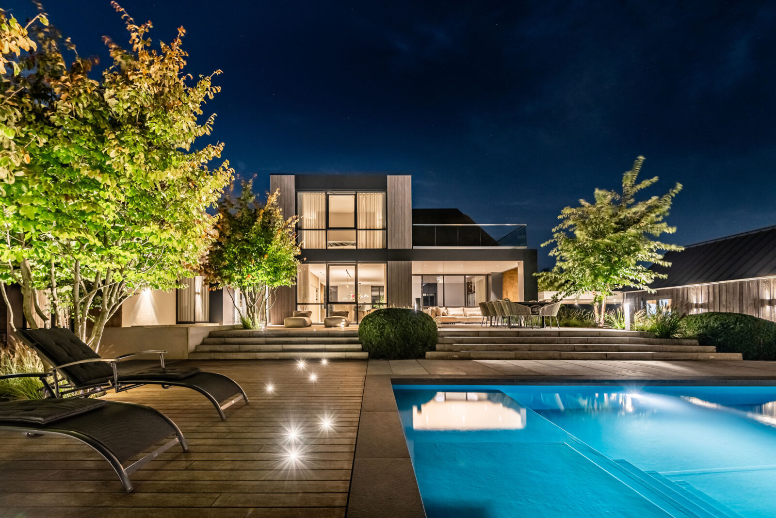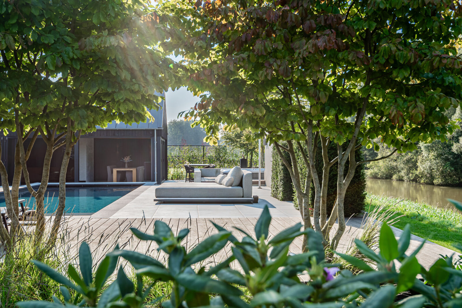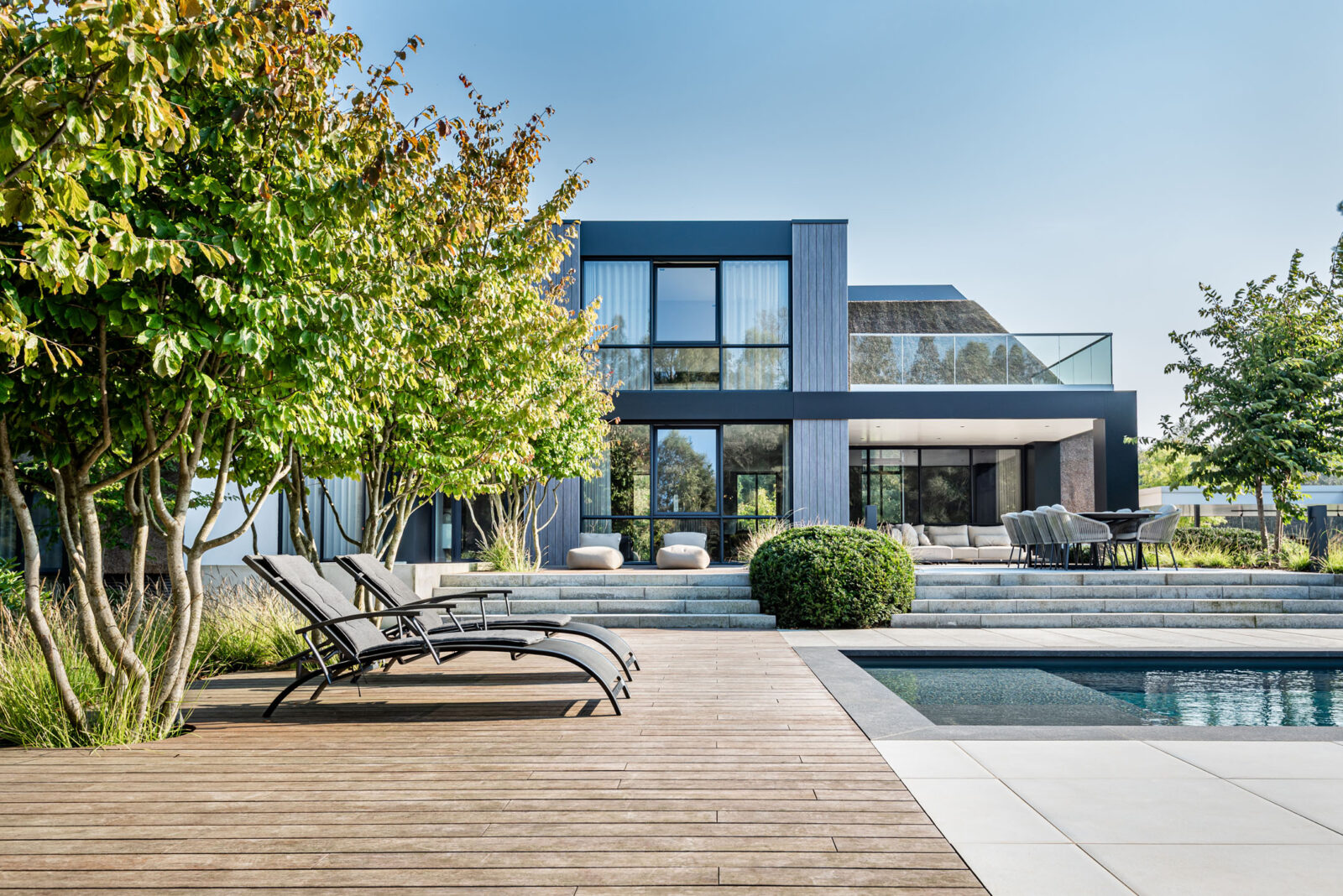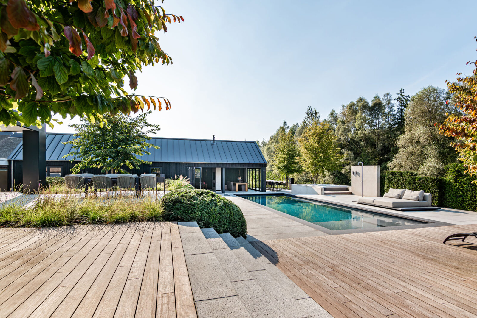 Deze tuin straalt moderne luxe en een prachtige overgang naar de omliggende natuur. Strakke lijnen en natuurlijke stoere materialen gecombineerd met kwaliteit en luxe. Het middelpunt is het zwembad, waar het hele gezin geniet van het samenzijn en het goede leven.